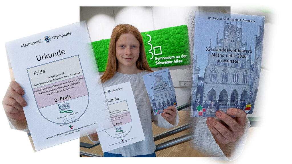Frida hat beim diesjährigen Dortmunder Mathematikwettbewerb eine herausragende Leistung gezeigt und in der Jahrgangsstufe 6 den ersten Platz belegt. Für diesen Erfolg wurde sie im Rahmen einer feierlichen Preisverleihung an der TU Dortmund geehrt.