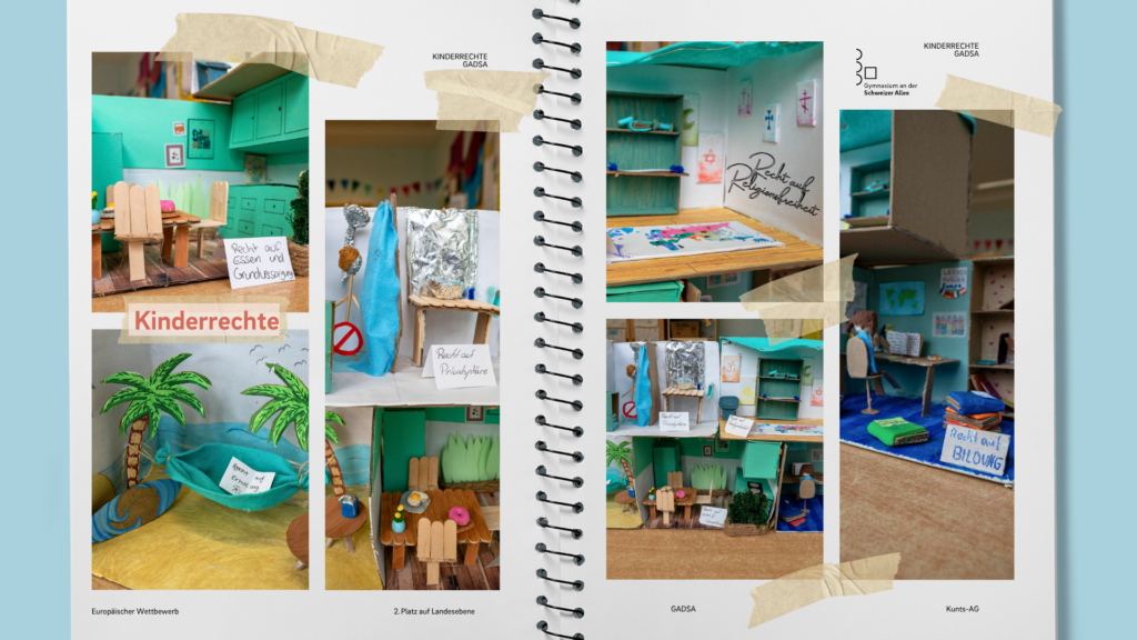 Wie sieht eigentlich ein Menschenrecht aus? Die Kunst-AG gibt darauf eine beeindruckend kreative Antwort: In selbstgebauten Zimmern aus Pappe setzen Mila (7b), Ida (7b), Julian (7e), Amal (5b) und Lia Jolie (5b) zentrale Grundrechte künstlerisch in Szene. Ob Recht auf Bildung , Religionsfreiheit oder Privatsphäre – jede Gestaltung ist sorgfältig durchdacht und individuell umgesetzt.