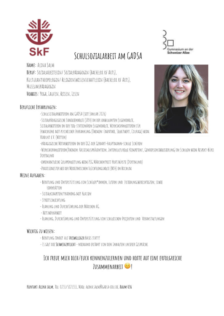 Schulsozialarbeit am GADSA ist ein freiwilliges Beratungsangebot für Schüler*innen, Sorgeberechtigte und Lehrkräfte für soziale Angelegenheiten, die den Schulalltag beeinflussen. Gemeinsam erarbeiten wir Handlungs- und Lösungsansätze für verschiedenste Herausforderungen.