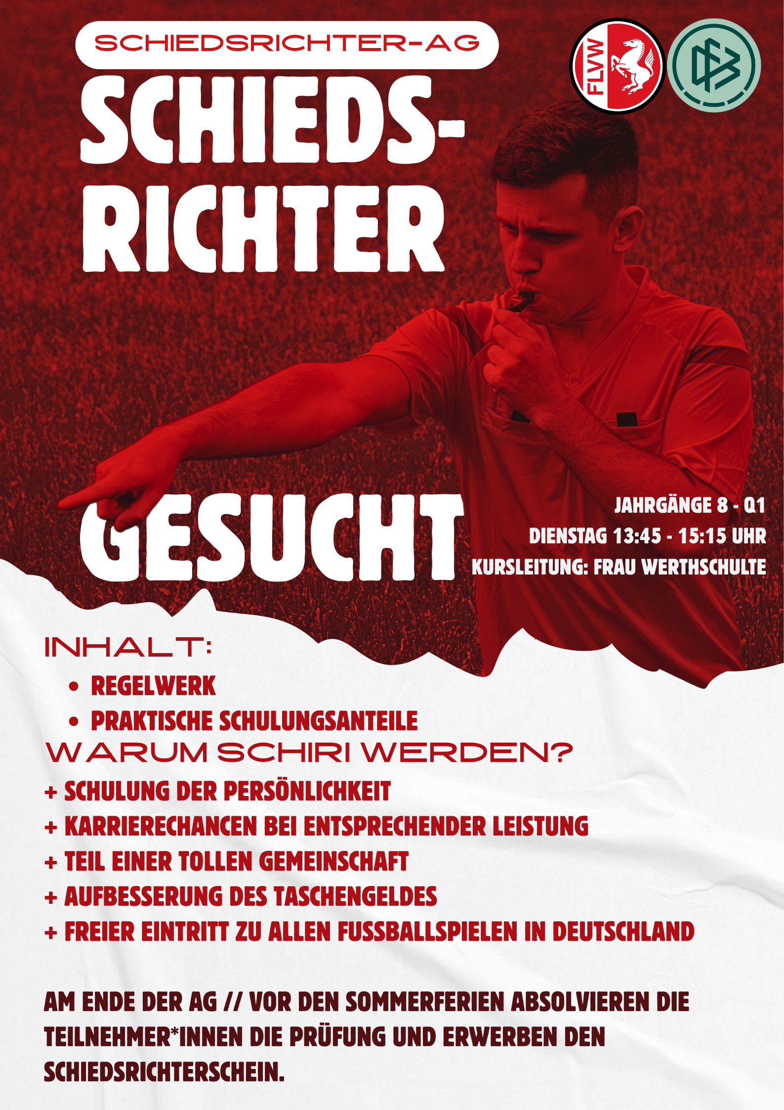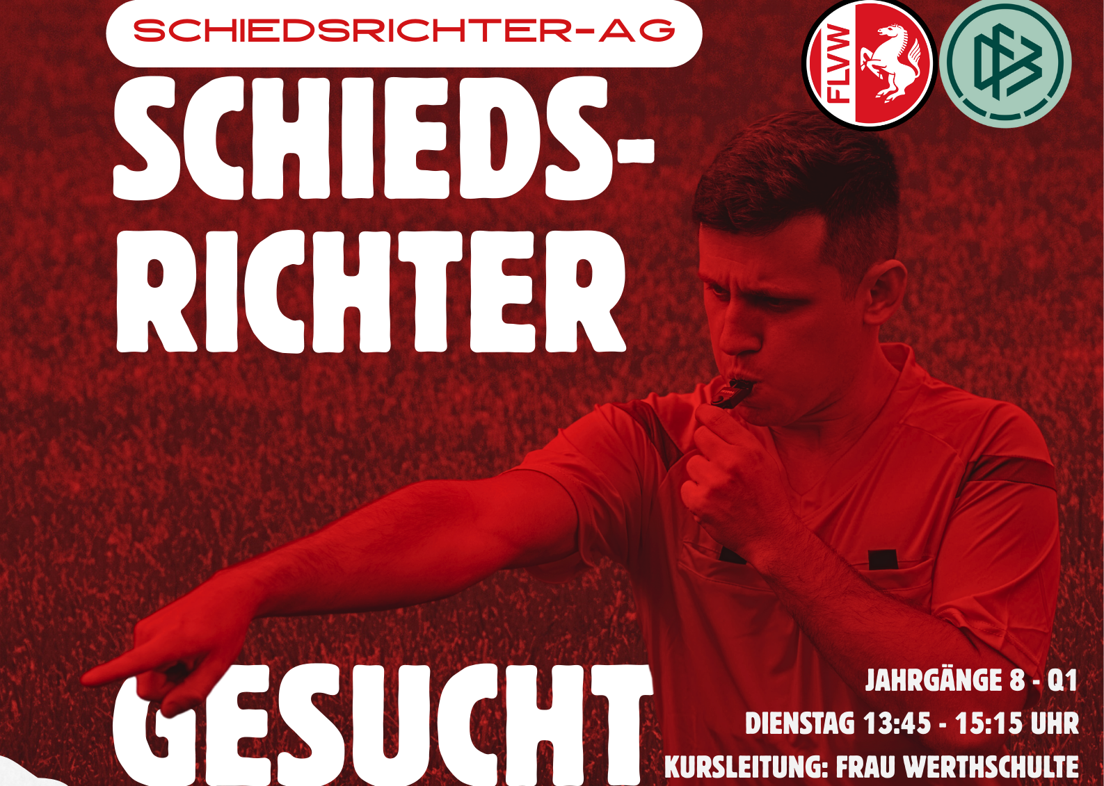 In Kooperation mit dem Fußball- und Leichtathletik-Verband Westfalen (FLVW) und dem Deutschen Fußball-Bund (DFB) und der Initiative von Frau Werthschulte bieten wir in diesem Jahr die Möglichkeit, eine Schiedsrichterausbildung zu absolvieren.