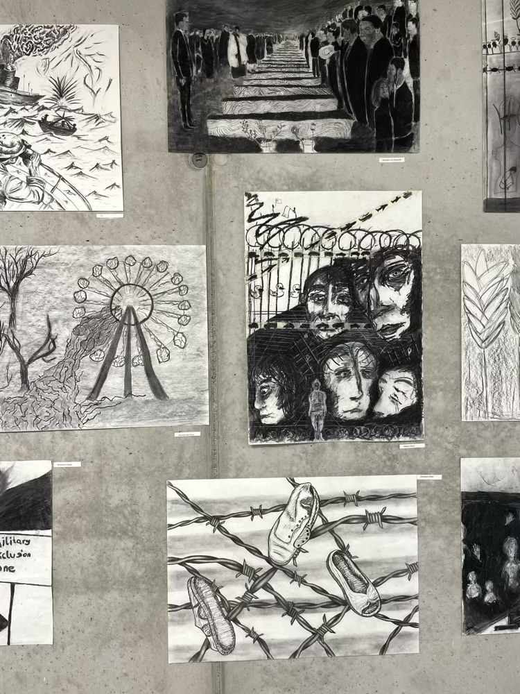 Der Kunstkurs der Q1 zeigt derzeit eine beeindruckende Werkreihe. Die Schülerinnen und Schüler haben sich intensiv mit gesellschaftlichen und politischen Katastrophen sowie deren oft problematischer Aufarbeitung auseinandergesetzt.