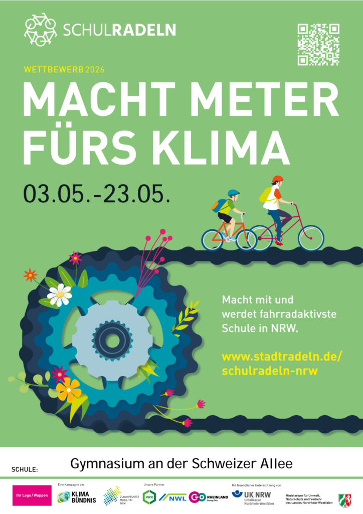 Nach unseren erfolgreichen Teilnahmen in den vergangenen Jahren wollen wir auch in diesem Frühjahr gemeinsam in die Pedale treten – für den Klimaschutz, für unsere Gesundheit und für unsere Schulgemeinschaft! Auch dieses Mal sind wir beim „Stadtradeln“ bzw. „Schulradeln“ dabei, der großen Kampagne des Klima-Bündnis zur Förderung des Radfahrens und zum Schutz unseres Klimas.